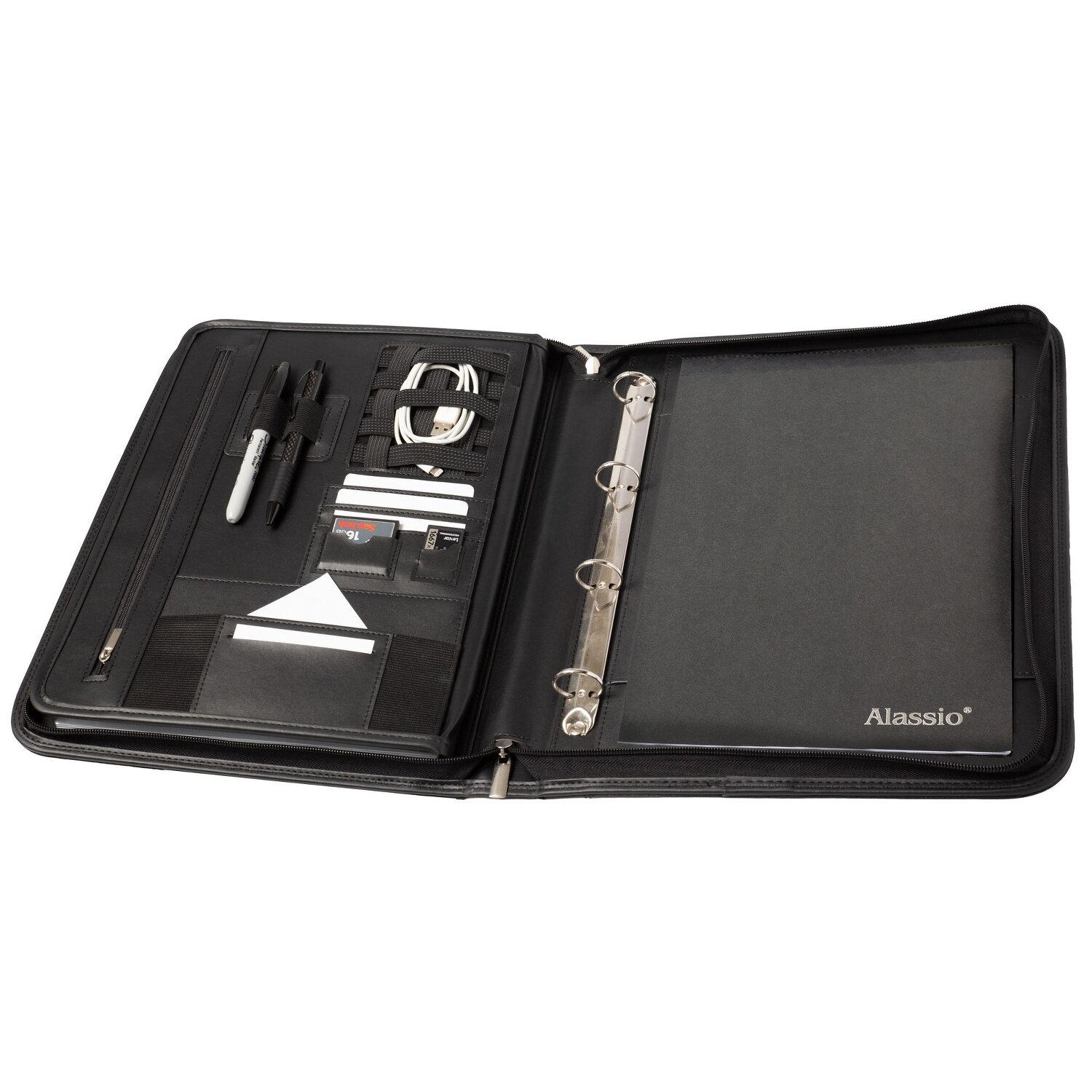 El lujoso estuche de Alassio, fabricado en polipiel de alta calidad, es todo un talento organizativo. La carpeta cuenta con un mecanismo de anilla extraíble, un bloc de notas, cuatro ranuras para tarjetas de crédito, dos bolsillos para tarjetas de memoria o SIM y cinco trabillas elásticas para cables, auriculares o memorias USB. La carpeta también está equipada con un soporte extraíble para tableta. El compañero fiel para el día a día. (El equipamiento que aparece en las imágenes, como teléfonos móviles, blocs de notas, etc., no está incluido).