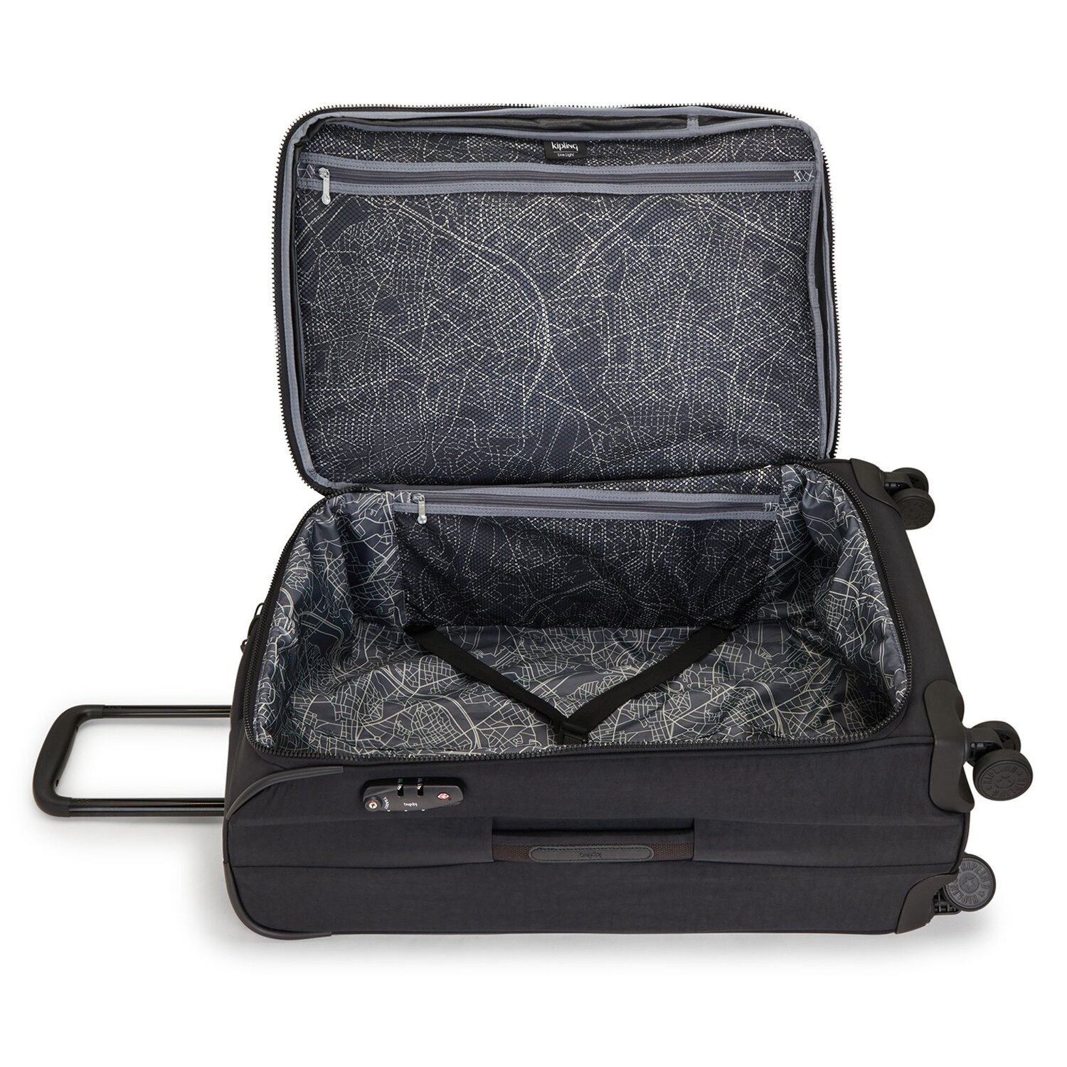 Robusto trolley de diseño clásico Kipling con 4 ruedas y asa telescópica bloqueable. El trolley impresiona por su estabilidad y funcionalidad, y ahorra espacio gracias a su espacioso compartimento principal con correas y compartimentos laterales adicionales. El compañero ideal para su próximo viaje.