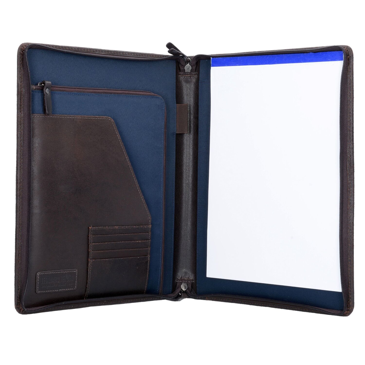 Maletín de escritura robusto y de alta calidad de Leonhard Heyden fabricado en cuero fino. La carpeta tiene un compartimento para el portátil, dos bolsillos abiertos y cuatro ranuras para tarjetas de crédito. Con este maletín estará perfectamente equipado. (El equipamiento que aparece en las imágenes, como teléfonos móviles, blocs de notas, etc., no está incluido).