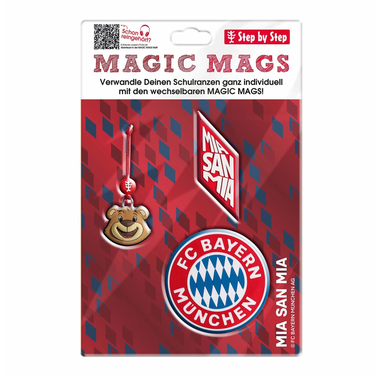 Imaginativos MAGIC MAGS en varios motivos que se pueden fijar a las mochilas escolares y preescolares Step by Step en la edición Fc Bayern. Su hijo puede intercambiar, combinar o eliminar por completo los motivos a su gusto. Un juego contiene dos MAGIC MAGS y un colgante adicional que se puede enganchar a un lazo para colgar.